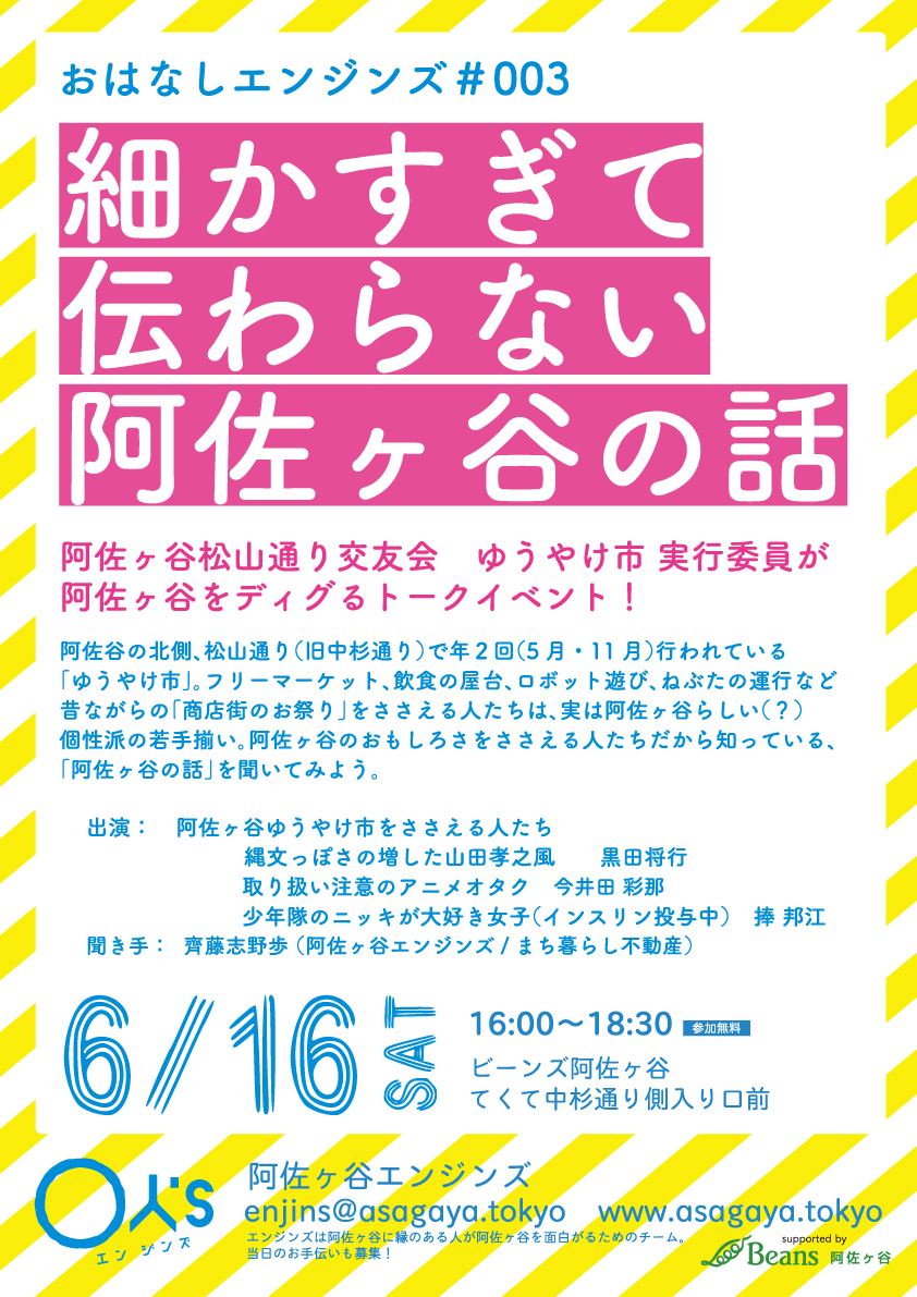 阿佐谷の北側、松山通り(旧中杉通り)で年2回(5月・11月)行われている「ゆうやけ市」。フリーマーケット、飲食の屋台、ロボット遊び、ねぶたの運行など昔ながらの「商店街のお祭り」をささえる人たちに、阿佐ヶ谷のおもしろさを聞いてみる会。
