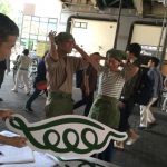 で、調子に乗ってマメの顔ハメ、大きいサイズのを作ってみました。なんと3人同時にハメられます。笑