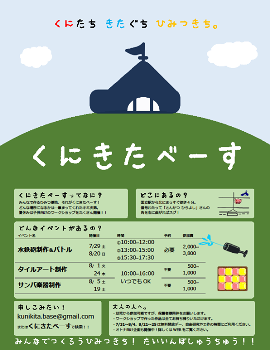 大人も子供も、楽しめるものづくりワークショップが、国立駅北口側の秘密基地’くにきたべーす’さんで開催されます。