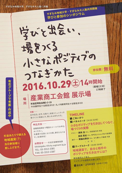杉並区の地域活動、社会教育、生涯学習の場、「すぎなみ地域大学(区民部・協働推進課)」と「すぎなみ大人塾(教育委員会・社会教育センター)」共催によるシンポジウムにおいて、会の進行などをいたします。