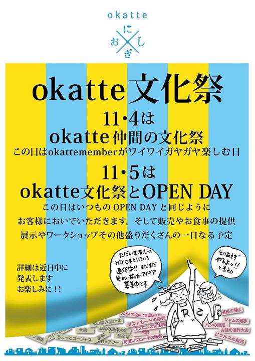 By okatteにしおぎ Posted 2017/09/20 In okatteにしおぎ 11月5日(日)のオープンデーは2017-09-202017-09-26https://www.n95.jp/wp-content/uploads/2014/09/n95logo_250-125.pngN9.5 INC.https://www.n95.jp/wp-content/uploads/2017/09/79cb181143ed8af560d2-1.jpg200px200px 0 11月5日(日)のオープンデーは \\okatte文化祭// okatteメンバーの多彩な芸術家が集まって 楽しい、美味しい文化祭。 展示物あり、販売あり。 新米の季節、美味しいランチやカフェも。 明細は後日。 お楽しみに!! Facebook Recent Posts空き家活用すごろく!家でこもる人たちに送る「距離観コラム」。家でこもる人たちに送る「距離観コラム」。家でこもる人たちに送る「距離観コラム」。