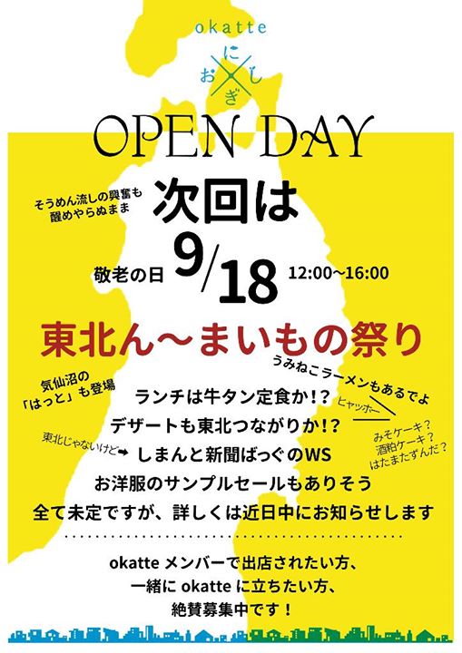 By okatteにしおぎ Posted 2017/09/03 In okatteにしおぎ 9月18日 okatteオープンデーは、2017-09-032017-09-26https://www.n95.jp/wp-content/uploads/2014/09/n95logo_250-125.pngN9.5 INC.https://www.n95.jp/wp-content/uploads/2017/09/9de0bb3e0830755deb17-1.jpg200px200px 0 9月18日 okatteオープンデーは、 東北の美味しいご飯&スイーツ! 明細は近日、お知らせします。 どなたでもwelcomeですので、 ぜひお越し下さいませ~。 Facebook Recent Posts空き家活用すごろく!家でこもる人たちに送る「距離観コラム」。家でこもる人たちに送る「距離観コラム」。家でこもる人たちに送る「距離観コラム」。